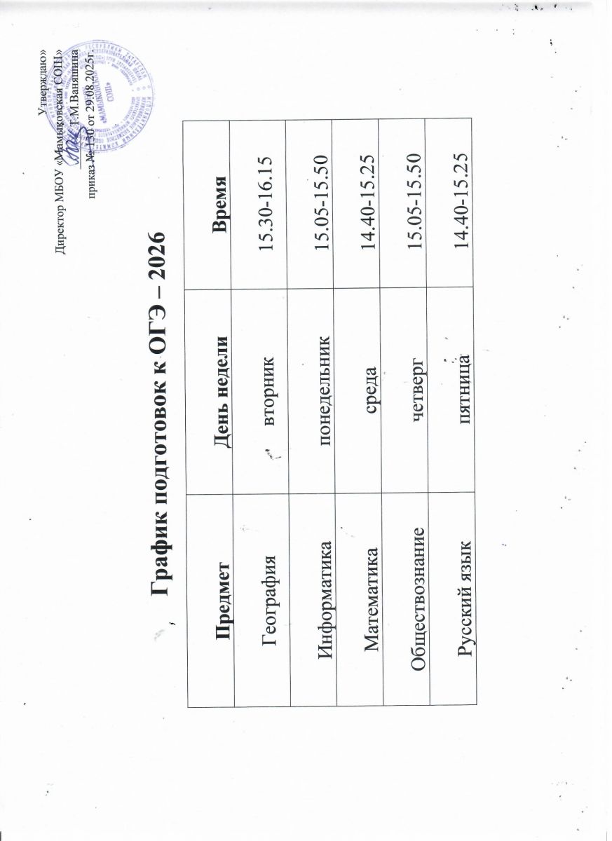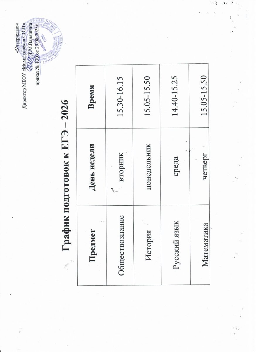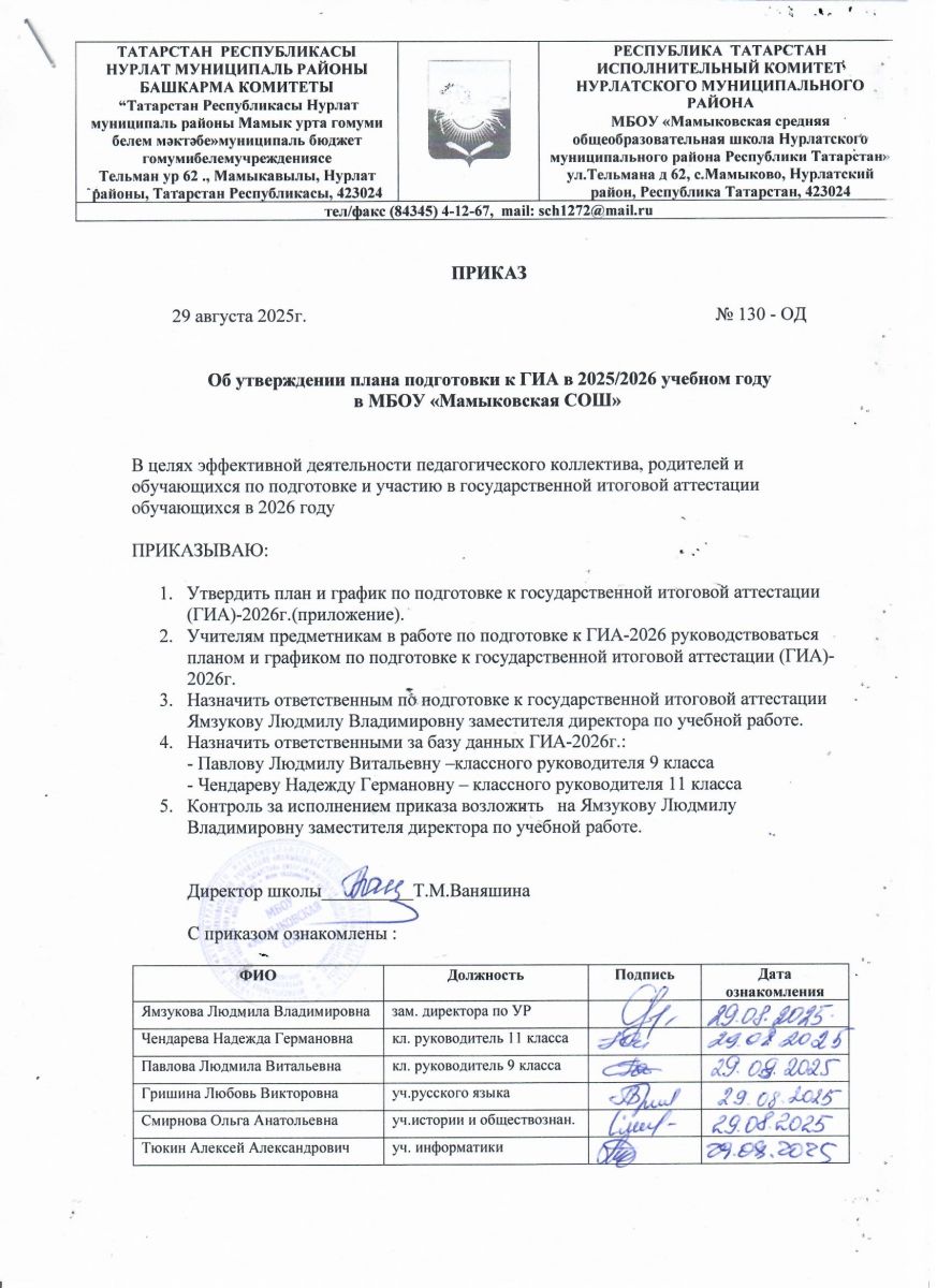 Приказ МБОУ "Мамыковская СОШ" об утверждении графиков подготовок к ГИА-2026