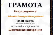 Ученица МАОУ "Нурлатская гимназия им.М.Е.Сергеева" г.Нурлат Айсина Самира Ильсуровна заняла 3 место , в категории Девушки до 15 лет. Поздравляем и желает дальнейших успехов и новых побед в мире шахмат. Мы гордимся нашими учениками и их достижениями!