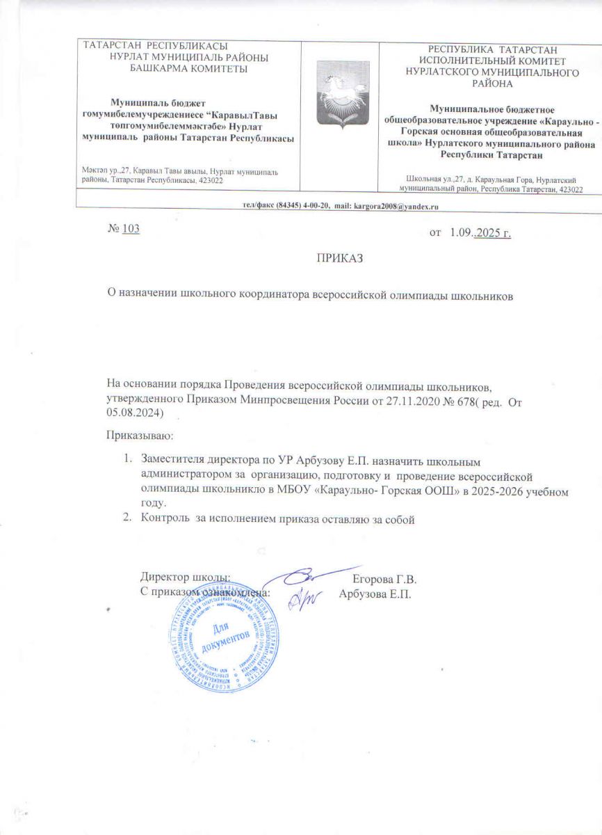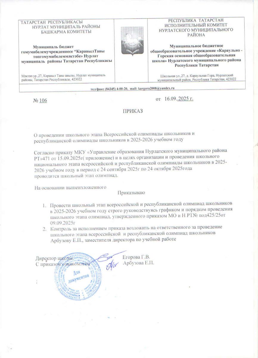 Приказ о проведении ШЭ ВОШ 2025-2026г в МБОУ Караульно-Горская ООШ