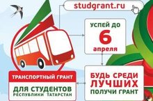 Объявляется весенний конкурс 2016 года!Конкурс по выделению грантов на оплату транспортных услуг студентам очной формы обучения профессиональных образовательных организаций и образовательных организаций высшего образования Республики Татарстан 2016 года.Участники конкурса: студенты очной формы обучения профессиональных образовательных организаций и образовательных организаций высшего образования, не имеющие академической задолженности по итогам сессий, принимающие активное участие в общественной, научной, творческой и спортивной деятельности образовательной организации и республики.Размер гранта: 4800 рублей единовременно (800 рублей в месяц за январь – июнь 2016 года). -