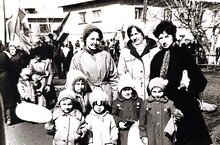 Мария Петровна прислала фотографию, на которой она запечатлена во время первомайской демонстрации со своей мамой, также на фотографии присутствуют коллеги родителей со своими детьми. Родители советника также работали педагогами в нашем образовательном учреждении практически с самого его основания и до ухода на заслуженный отдых.