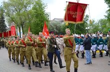 Торжественный марш Парада Победы в составе колонны открыли студенты техникума со штандартом Прибалтийского фронта.