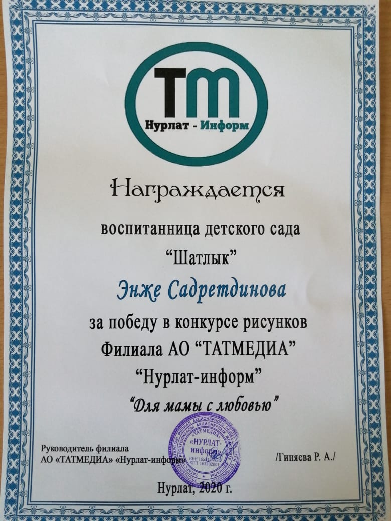 Воспитанниица средний группы Садретдинова Энже победила в конкурсе рисунков"Для мамы с любовью"