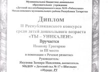 Воспитатель Якупова Замира Наилевна с воспитанником Ивановым Григорием участвовали во 2 Республиканском конкурсе "Ты уникален!" и заняли 3 место в номинации "Речевое развитие"/ Тәрбияче Якупова Зәмирә Наиль кызы Иванов Григорий белән Республика конкурсында"Сөйләм телен үстерү" номинациясе буенча 3 урын алдылар.