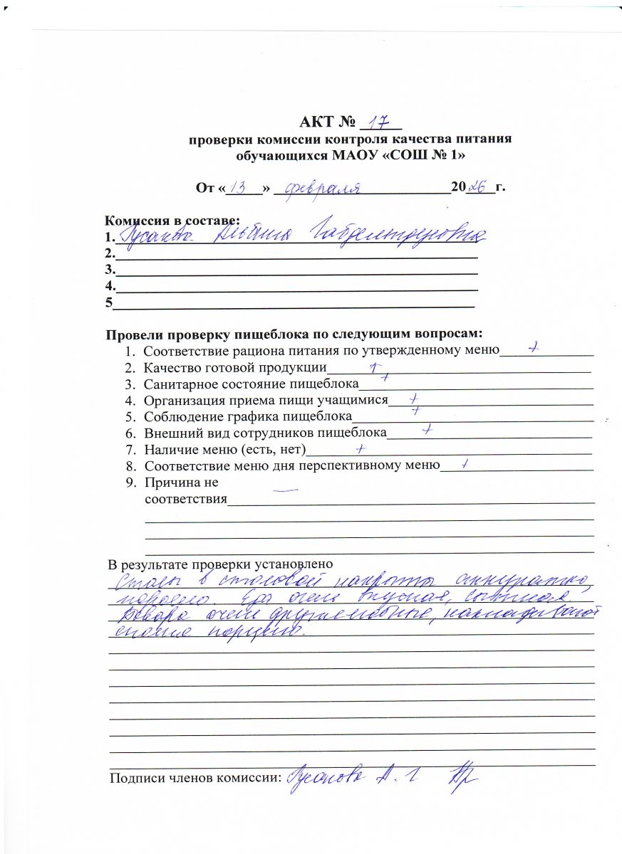 Акт № 17 проверки комиссии контроля качества питания обучающихся МАОУ СОШ № 1