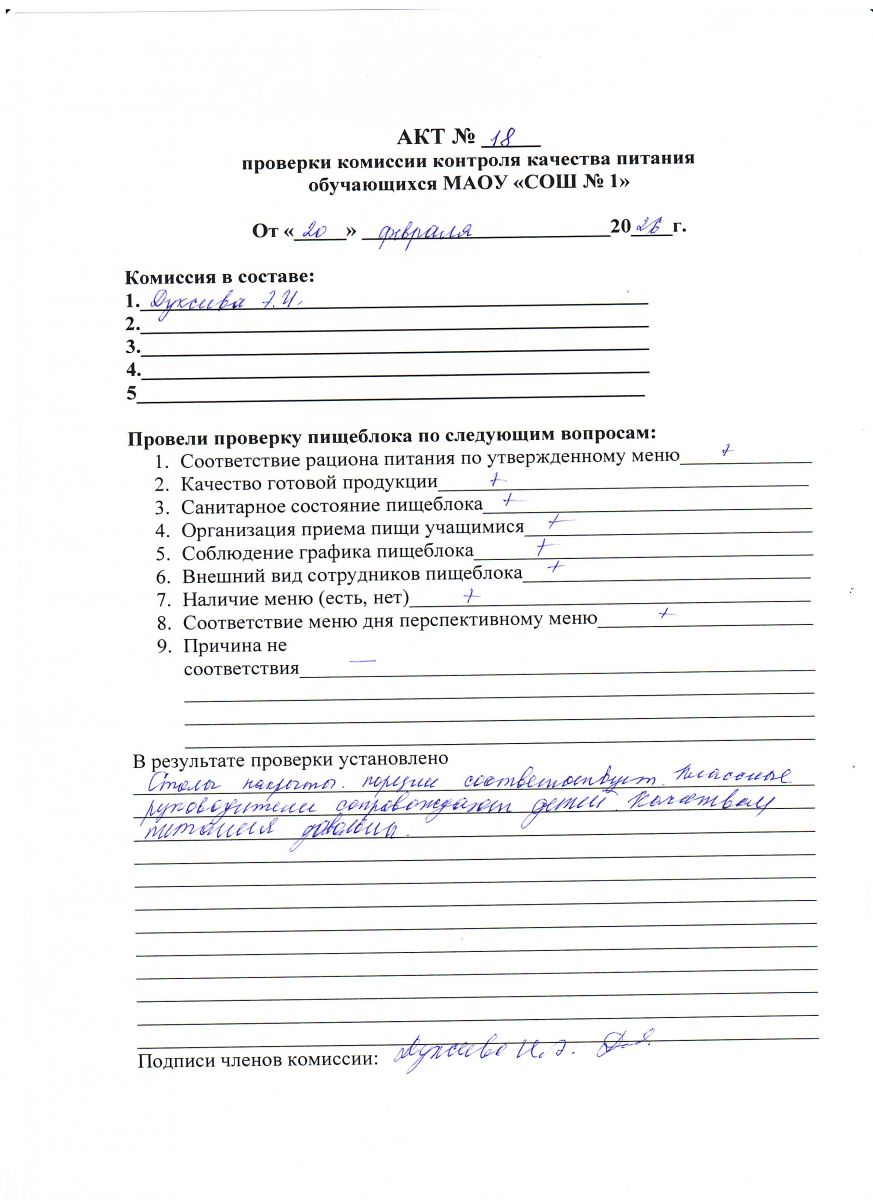 Акт № 20 проверки комиссии контроля качества питания обучающихся МАОУ СОШ № 1