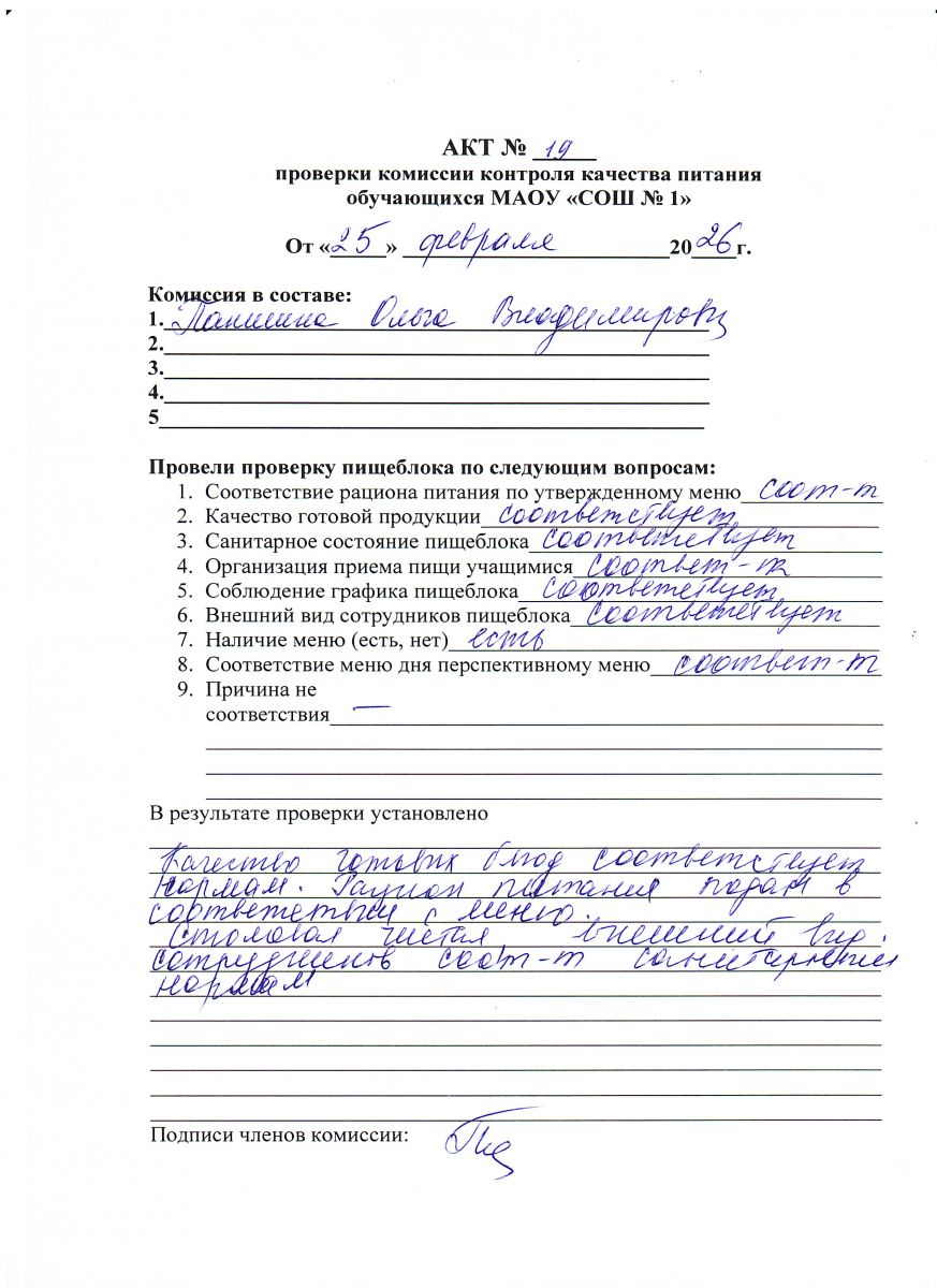 Акт № 26 проверки комиссии контроля качества питания обучающихся МАОУ СОШ № 1