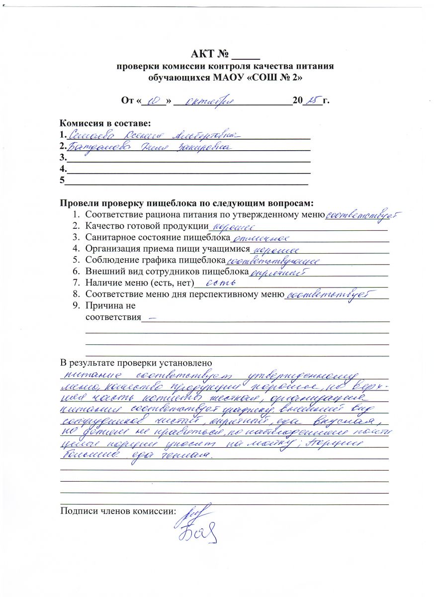 Акт проверки комиссии контроля качества питания от 10.10.2025