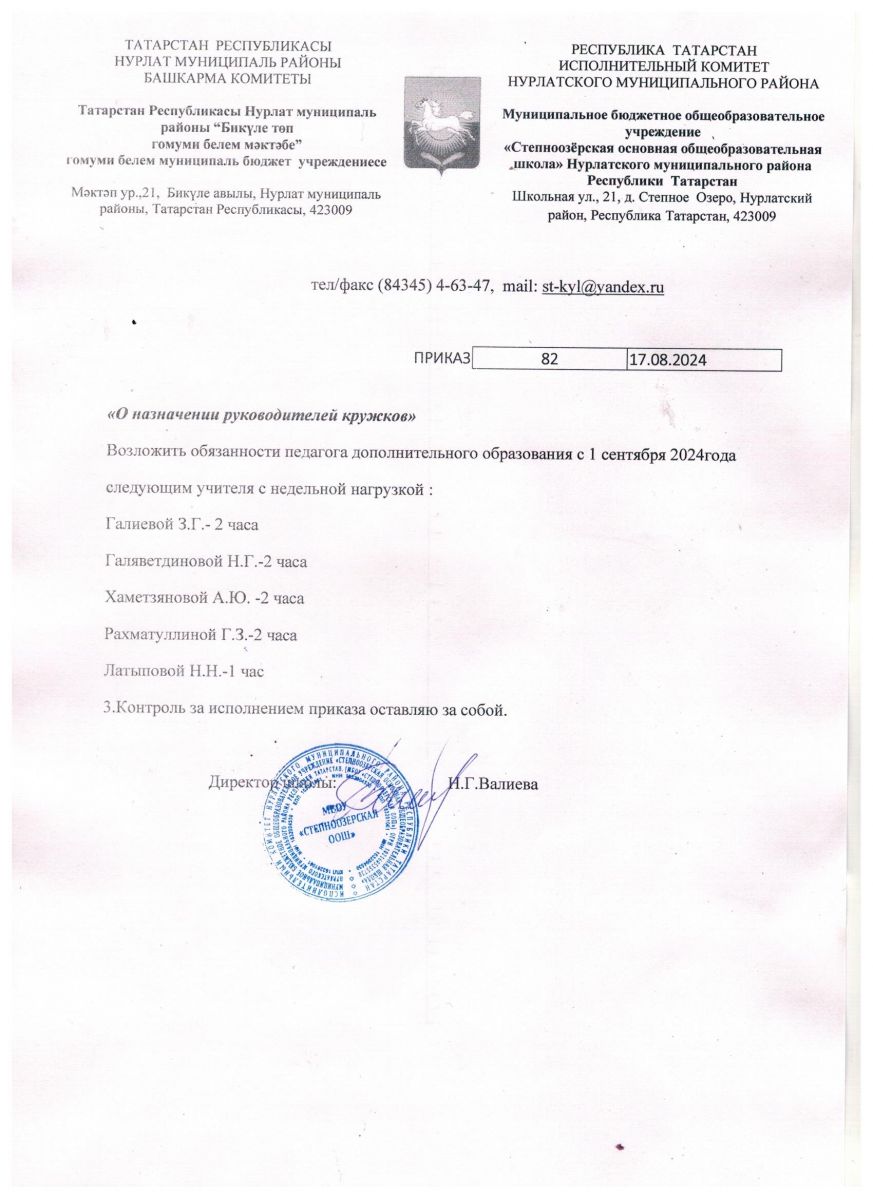 Приказ №82 от 17.08.2024 г. "О назначении руководителей кружка"