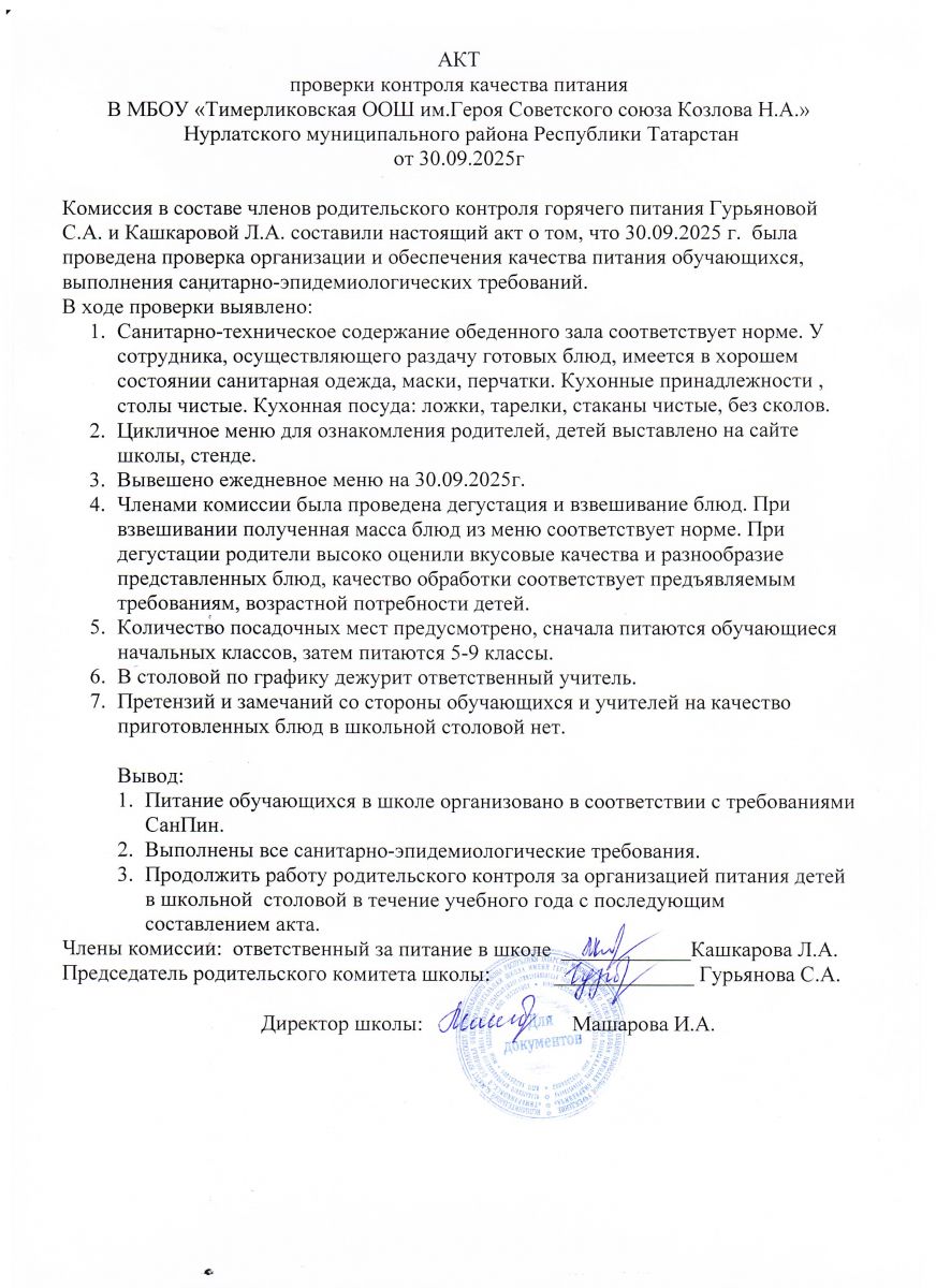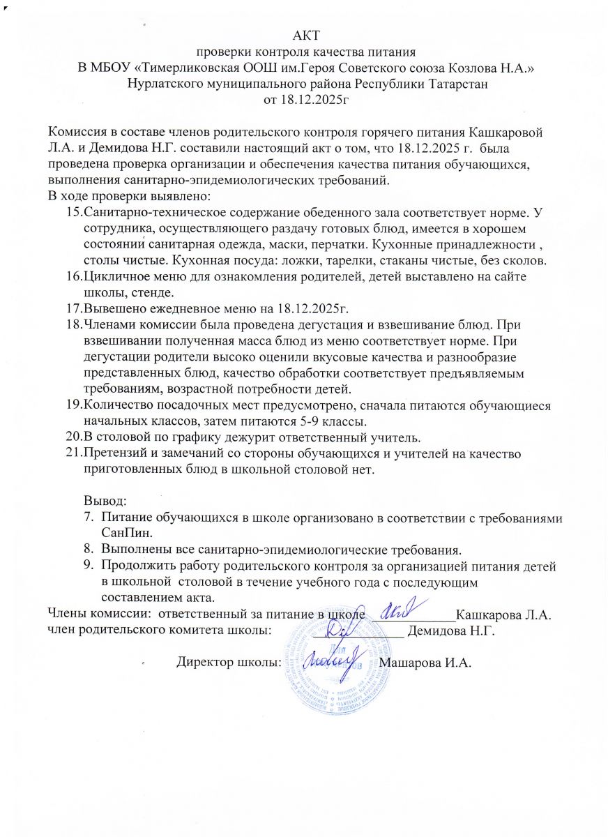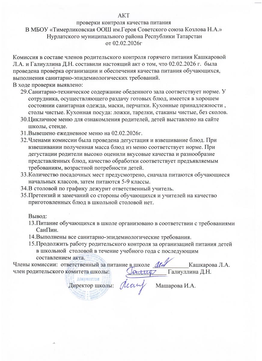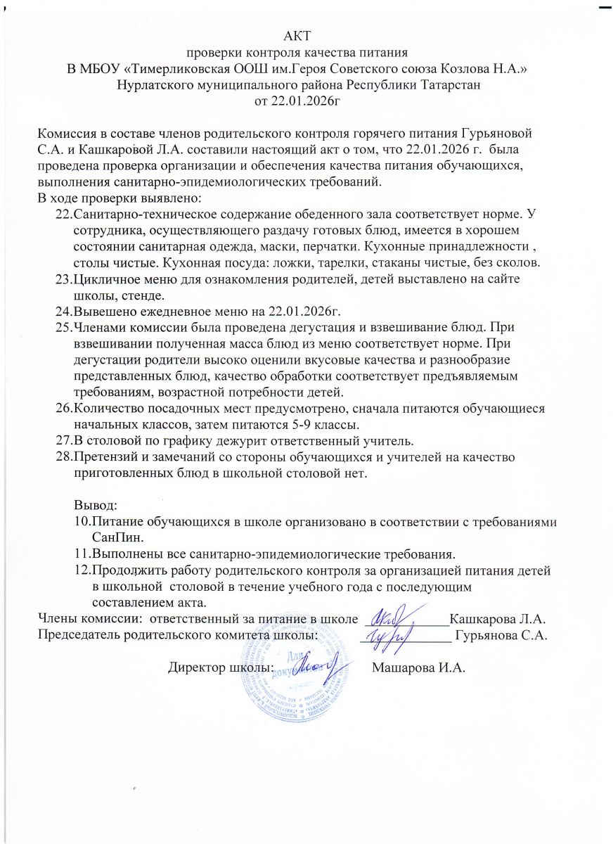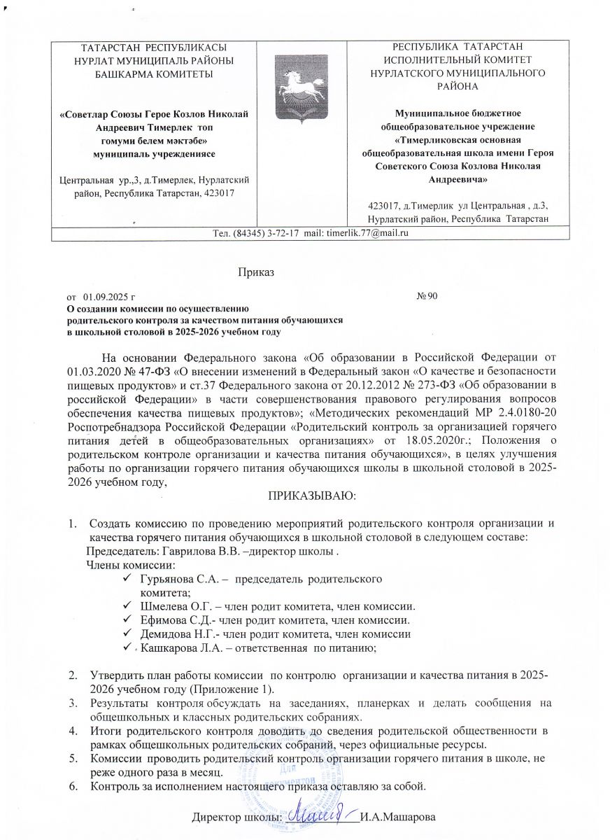 Телефон: 8(84345) 2-06-14, 8(84345) 2-25-61( факс) Email: Nurlat.ispolkom@tatar.ru Официальный сайт: www.nurlat.tatarstan.ru/ Официаль сайты: www.nurlat.tatarstan.ru График работы: Понедельник-Суббота - 7.00-16.00, воскресенье-выходной/ Эш графигы: Дүшәмбе-шимбә 8:00 дән 16:00 га кадәр. Начальник отдела образования Нурлатского муниципального района - Рахматуллина Алсу Насыховна Телефон: 8(84345) 2-06-75 (приёмная) График работы: Понедельник - суббота - 8.00-17.00, воскресенье - выходной Информация о руководителе МБОУ "Тимерликовская ООШ им.Героя Советского Союза Козлова Н.А." Нурлатского муниципального района Республики Татарстан/ ТР Нурлат муниципаль районы МБГБУ "Советлар Союзы Герое Николай Андреевич Козлов исемендәге Тимерлик төп гомуми белем мәктәбе" җитәкчесе турында мәгълүмат Директор: Машарова Ирина Аркадьевна/ Директор Машарова Ирина Аркадьевна График работы: Пн-Сб. 8.00-17.00/ Эш графигы: Дүшәмбе-шимбә 8:00 дән 17:00 гә кадәр Справочный телефон: (84345) 3-72-17/ Белешмә өчен телефон: (884345) 3-72-17 Электронная почта: masharova-1975@mail.ru/ Электрон почта: masharova-1975@mail.ru /upload/storage/org1668/files/меню 12 дневное осень 2025г.pdf /upload/storage/org1668/files/годовой календарный график (1)(3).pdf /upload/storage/org1668/files/1-4 классы меню 2025-2026 уч_год осень(2).pdf /upload/storage/org1668/files/Бюджет меню 2025- 2026 уч_год осень(1).pdf /upload/storage/org1668/files/986 от 04_09_2025 г_ об орган_ питания (1)(1).pdf /upload/storage/org1668/files/приказ о создании комиссии по контролю качества питания.jpg /upload/storage/org1668/files/акт проверки контроля 30_09_25(1).jpg /upload/storage/org1668/files/акт проверки контроля 28_11_25(1).jpg /upload/storage/org1668/files/акт проверки питания 18_12_25(1).jpg /upload/storage/org1668/files/акт проверки питания 22_01_26(1).jpg /upload/storage/org1668/files/акт проверки питания от 02_02_26.jpg