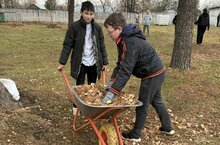 Осенняя пора. Дети участвуют в акции по уборке территории школы.