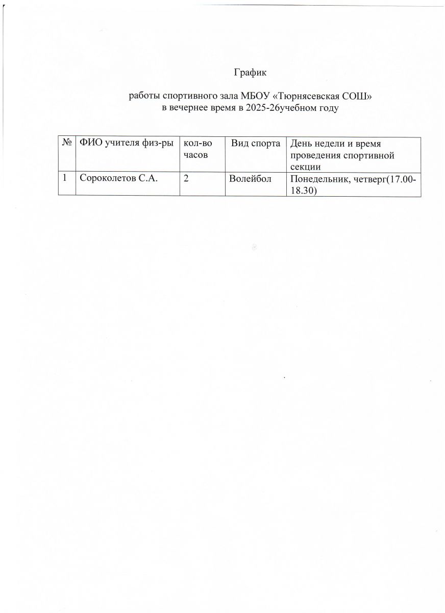 Расписание работы спортивных секций Тюрнясевской СОШ во внеурочное время в 2025-26 учебном году