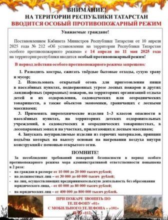 Внимание на территории Республики Татарстан вводится особый противопожарный режим 16.04.2025