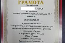 Поздравляем с победой в конкурсе воспитателя Садыкову Ларису Николаевну и её воспитанника Данила С.! От всей души желаем нашим воспитанникам и педагогу новых творческих побед и успехов!
