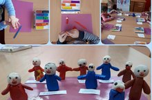 Лепка "Маленькие куколки гуляют на снежной поляне" Цель занятия: сформировать у детей умение лепить предмет, состоящий из двух частей: столбика ( шубка) и круглой формы ( голова); раскатывать пластилин между ладонями прямыми и кругообразными движенями, соединять части предмета приемом прижимания.