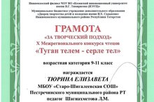 Поздравляем ученицу 9 класса Тюрину Елизавету с грамотой за творческий подход в X Межрегиональном конкурсе чтецов «Туган телем - серле тел»