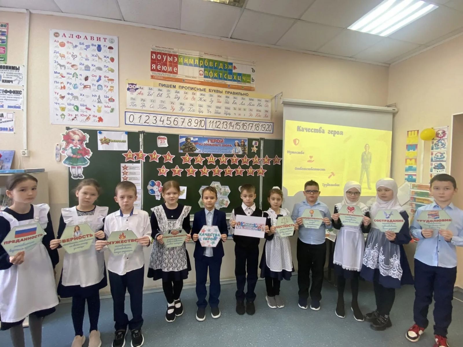 | У нас учат: | 29 учителей/ укытучы, 2 воспитателя/тәрбияче, 1 библиотекарь, 1 советник, 1 педагог-организатор, 1 педагог-психолог) |