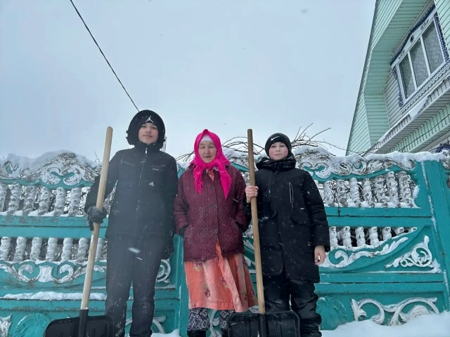 Тимуровцы в действии! Ученики 5 «А» класса под руководством классного руководителя Замалеевой Т. С. теплом и заботой помогают взрослым очистить двор от снега — пример настоящего милосердия и активности!