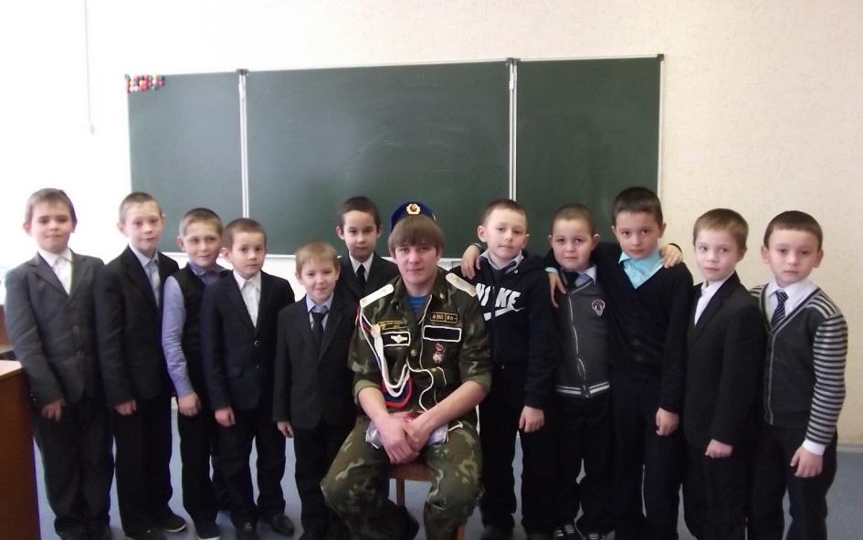 Солдат Зайнуллин Риаз белән очрашу Хәрби-патриотик айлык кысаларында 1 б сыйныф укучылары Армия сафларында хезмәт иткән солдат Зайнуллин Риаз белән очраштылар.