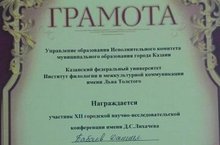 Ученик 3 В класса Бабаев Данил (учитель Закирова Айгуль Халимовна) награждён грамотой участника XII городской научно-исследовательской конференции имени Д.С.Лихачёва прошедшей на базе института филологии и межкультурной коммуникации имени Льва Толстого.