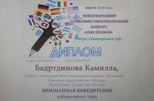Поздравляем ученицу 7Б класса Бадртдинову Камиллу с дипломом победителя отборочного тура международного социально - образовательного конкурса "Язык предков" !