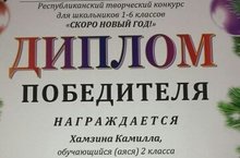 Поздравляем ученицу 2 В класса Хамзину Камиллу (учитель Егорова Рамиля Рифатовна) с дипломом победителя на Республиканском творческом конкурсе для школҗников 1-6 классов "СКОРО НОВЫЙ ГОД !"