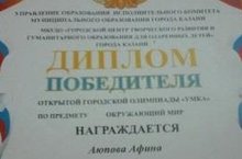 Ученица 1 В класса Аюпова Афина (учитель Сабирова Гульчачак Мансуровна) стала победителем открытой городской олимпиады "Умка" по предмету окружающий мир. Поздравляем!!! Желаем достижения ещё лучших успехов !!!