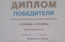 Поздравляем ученицу 2"б" класса Шарапову Азалию (учитель Гафарова И.И.) с победой в открытой олимпиаде для младших школьников "Техника чтения" проводимой МБУДО "Городской центр творческого развития и гуманитарного образования для одарённых " г.Казани. Желаем ей достижения ещё больших побед.