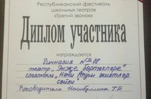 Мәктәп театрлары арасында үткәрелгән " Третий звонок " Республика фестивалендә " Нәни Апуш әкиятләр сөйли "спектакле белән катнашкан гимназиябезнең " Энҗе бөртекләре " театр түгәрәгенә рәхмәтебезне белдереп тагында зур уңышлар телибез .Җитәкчесе Насибуллина Г.Р.