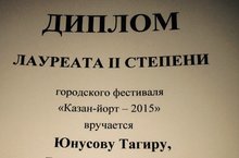 Ученик 1А класса Юнусов Тагир награжден ДИПЛОМОМ ЛАУРЕАТА II степени городского фестиваля "Казан -йорт - 2015" в номинации "Художественное слово" (руководитель: Насибуллина Гульфия Растамовна). МОЛОДЕЦ!!! ПОЗДРАВЛЯЕМ!!!