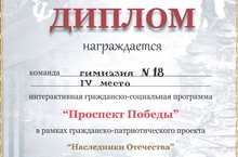 22ого января 2015г команда 10ого класса гимназии приняла участие в инерактивной гражданско-социальной программе ""Проспект Победы" в рамках гражданско-патриоического проекта "Наследники Отечества" и заняла IV место. ПОЗДРАВЛЯЕМ! МОЛОДЦЫ!
