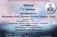 Махмутова Аделя, Ахметова Альбина, Садикова Алина приняли участие в открытом городском литературно - театральном конкурсе "Мятежный гений вдохновенья". По результатам конкурса ученицы нашей гимназии были награждены Дипломом II степени в номинации "Литературно - музыкальная композиция"(учитель Пашкова С.Ф.) ! Молодцы!!!