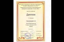 Ученик 4 класса Булат Миннахметов награжден Дипломом II степени Кафедры физико – математического образования Санкт – Петербургской академии постдипломного педагогического образования МетаШкола за участие в Открытой российской математической интернет – олимпиаде «Осень 2012». ПОЗДРАВЛЯЕМ!!! МОЛОДЕЦ!!!