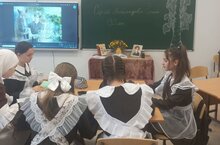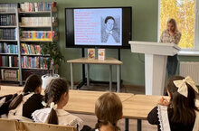 Чара барышында рус теле һәм әдәбияты укытучысы Светлана Федоровна укучыларны язучының иҗат юлы белән таныштырды, балалар шагыйрьнең шигырьләрен укыдылар. -
