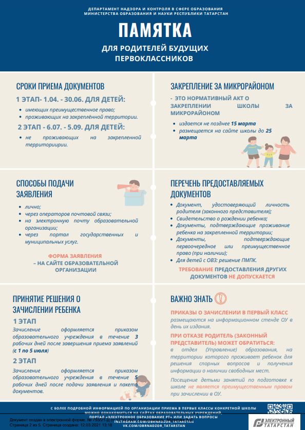 Сроки подачи заявлений от родителей определены приказом Минпросвещения РФ от 02.09.2020 №458 «Об утверждении Порядка приема на обучение по образовательным программам начального общего, основного общего и среднего общего образования».
