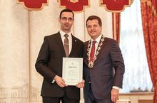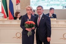 За заслуги в области образования, достойное воспитание подрастающего поколения учителю математики нашей гимназии Кузиной Марине Геннадьевне было присвоено почетное звание «Заслуженный учитель Республики Татарстан». Рустам Нургалиевич лично вручил соответствующий нагрудный знак.