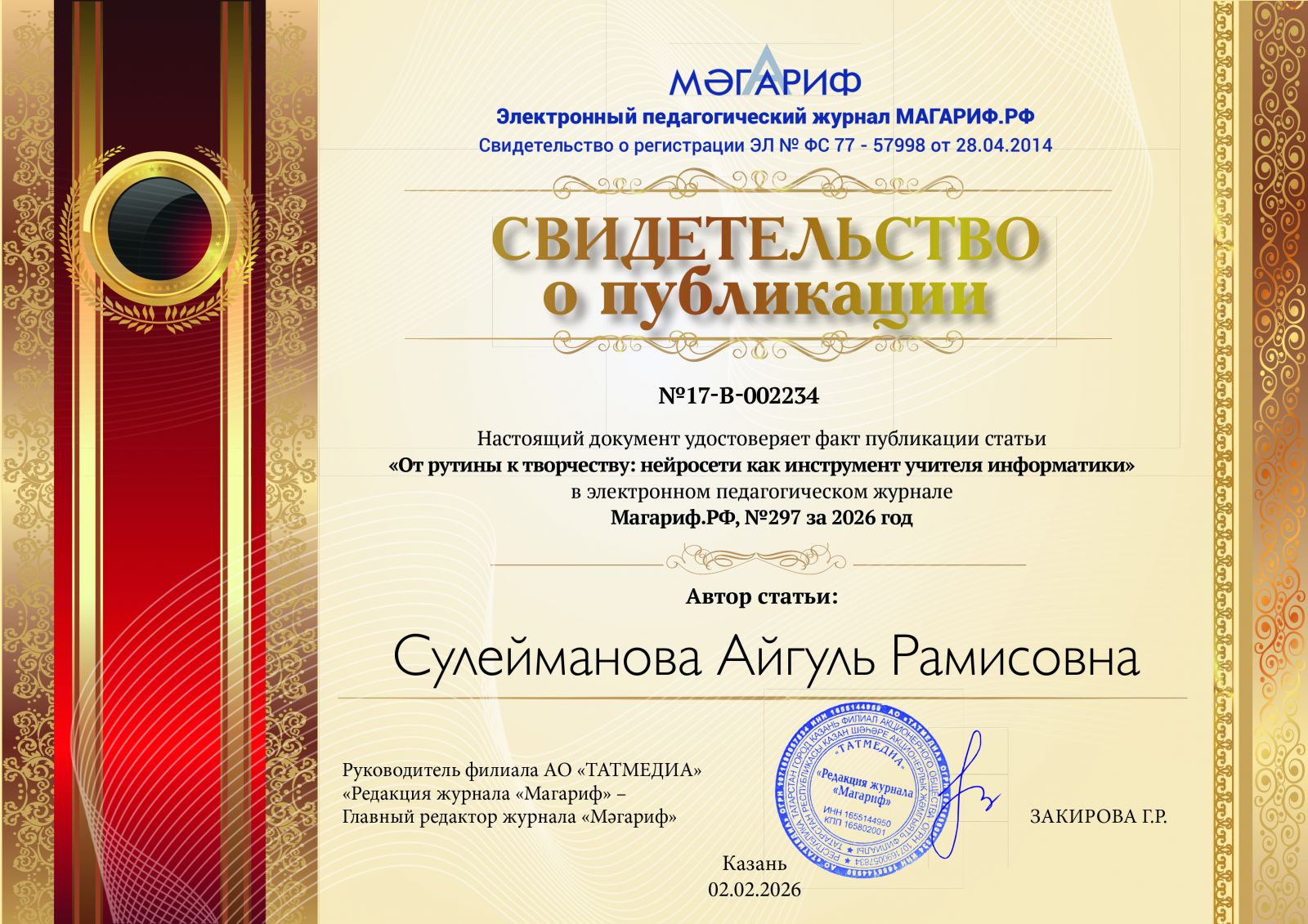 - Сулейманова А.Р. "От рутины к творчеству: нейросети как инструмент учителя информатики"