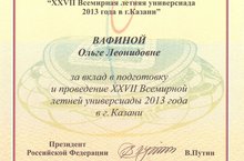 Поздравляем Ольгу Леонидовну Вафину с получением медали и Грамоты от Президента России В.В. Путина "За вклад в подготовку и проведение XXVII Всемирной летней Универсиады 2013 года в г. Казани" на церемонии награждения в НКЦ "Казань" 25 сентября.