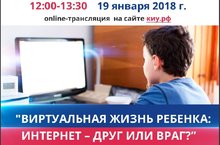 19.01.2018 с 12.00 до 13.30 состоится Республиканское родительское интернет-собрание «Виртуальная жизнь ребенка: интернет – друг или враг?». Он-лайн трансляция собрания будет вестись на сайте Казанского инновационного университета имени В.Г.Тимирясова по адресу: https://ieml.ru/. -
