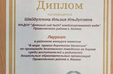 Идел буе һәм Вахитов районнары тәрбиячеләре өчен юл йөрү кагыйдәләре буенча уздырылган "БДД буенча иң яхшы мероприятенең сценарийсы" дигән конкурста катнашып, Лауреат дипломына ия булган тәрбиячебез Гилазетдинова Екатерина Сергеевнаны чын күңелдән котлыйбыз.