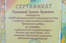 10.02.17 Казан шәһәре Идел буе районы 130 нчы номерлы балалар бакчасында "Ел тәрбиячесе-2017" конкурсында катнашучы һәм җиңүчеләрне бүләкләү тантанасы булды. Әлеге чарада бакчабыздан 1 нче кв. категорияле тәрбияче Газиҗанова Гөлгенә Булат кызы да катнашты һәм сертификат белән бүләкләнде.