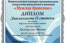 Всероссийский конкурс музыкального искусства мальчиков и юношей "Мужское братство" Хабибулов Ислам, Васякин Андрей номинация народные инструменты-гитара ДИПЛОМ Дипломанта II степени. Преподаватель Габдуллина Т.Р.