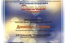 Пейсахова Илана стала Дипломантом I степени в номинации "инструментальное исполнительство фортепиано 7-9 лет" на ежегодном международном фестивале-конкурсе детского и юношеского творчества "Хрустальное сердце мира"