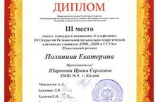 01 февраля 2015г. в Казанском музыкальном колледже им. И.В.Аухадеева состоялся III региональная музыкально-теоретическая олимпиада учащихся ДМШ, ДШИ и ССУЗов, в которой принимали участие Полянина Екатерина (преподаватель Шаронова И.С.) и Нутфуллина Аделина (преподаватель Сафина Л.Ш.). Учащиеся успешно прошли письменное испытание в I туре.Поздравляем Полянину Екатерину, занявшую III место в номинации «Сольфеджио».