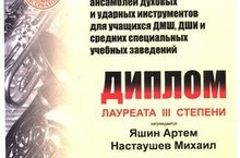 Яшин Артем и Настаушев Михаил ДИПЛОМ Лауреата III степени на VI Всероссийском конкурсе ансамблей духовых и ударных инструментов для учащихся ДМШ, ДШИ и средних специальных учебных заведений