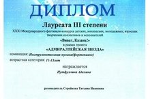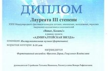 XXXI МЕЖДУНАРОДНОГО ФЕСТИВАЛЯ-КОНКУРСА ДЕТСКИХ И ЮНОШЕСКИХ, МОЛОДЕЖНЫХ, ВЗРОСЛЫХ ТВОРЧЕСКИХ КОЛЛЕКТИВОВ И ИСПОЛНИТЕЛЕЙ«ВИВАТ, КАЗАНЬ!»В РАМКАХ ПРОЕКТА «АДМИРАЛТЕЙСКАЯ ЗВЕЗДА» НАГРАЖДЕНАНУТФУЛЛИНА АДЕЛИНА В НОМИНАЦИИ: ИНСТРУМЕНТАЛЬНАЯ МУЗЫКА(ФОРТЕПИАНО)
