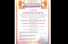Награждена ДИПЛОМОМ Лауреата III степени Хузиахметова Карина на I Республиканском конкурсе баянитов и аккордеонистов ДМШ и ДШИ "Ступени к мастерству".