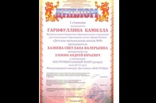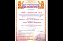 Награждена ДИПЛОМОМ Дипломанта II степени Нутфуллина Аделина за участие в Международном фестивале конкурсе детских, юношеских, молодежных и взрослых творческих коллективов и исполнителей «Виват, Казань!» в номинации "инструментальная музыка. фортепиано"