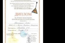 Прохоренко Павел - награжден Дипломом за лучшее исполнение произведения крупной формы на III Открытом Республиканском конкурсе исполнителей на балалайке, ансамблей народных инструментов и фольклорных ансамблей "КУДЕСНИЦА-БАЛАЛАЙКА" (класс преподавателя Матвеевой А.В.)