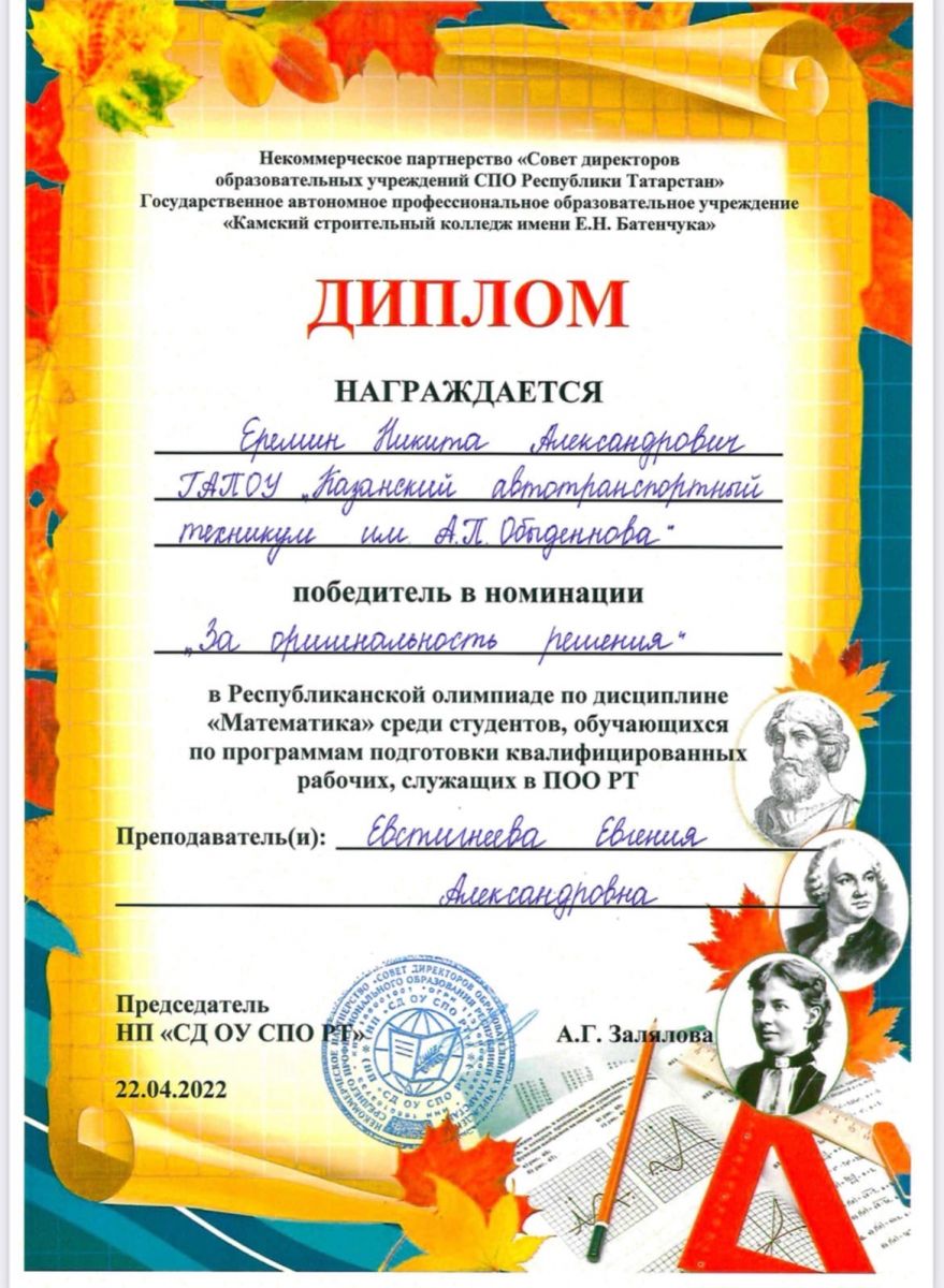 22 апреля 2022 года наши студенты: Кузнецов Семён (ТОД 219-1) и Еремин Никита под руководством преподавателя математики Евстигнеевой Евгении Александровны принимали участие в Республиканской олимпиаде по дисциплине «Математика» для студентов ПОО РТ.